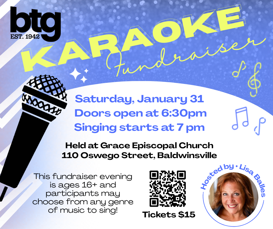 Get ready to belt out your favorite tunes at BTG's debut Karaoke Fund-Raiser Night, hosted by the fabulous Lisa Balles! Swing by Grace Episcopal Church for an evening brimming with music, laughter, and camaraderie—all while lending a hand to help BTG gear up for 2026.